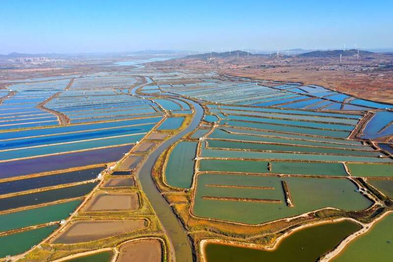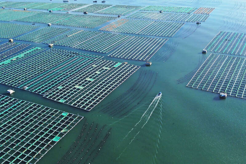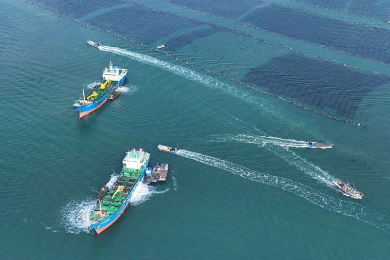 ↑ 11月10日,在山东省荣成市桑沟湾海洋草场,饲养工人在饲养区络绎作业(无人机相片)。新华社发(王福东 摄)