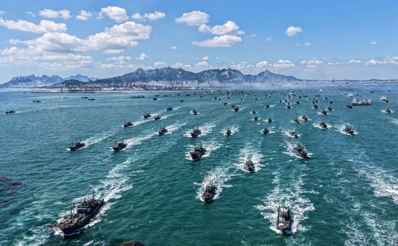 ↑ 在山东省荣成市石岛渔港,黄渤海休渔期完毕后,渔民驾驭渔船出海作业(9月1日摄,无人机相片)。新华社发(李信君 摄)