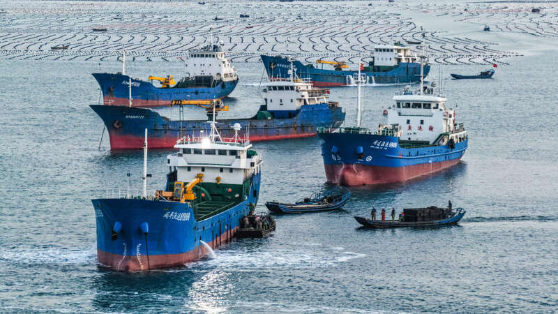 ↑ 11月11日,在山东省荣成市爱伦湾海洋草场,运鲜船在装运鲍鱼南下福建越冬(无人机相片)。新华社发(王福东 摄)